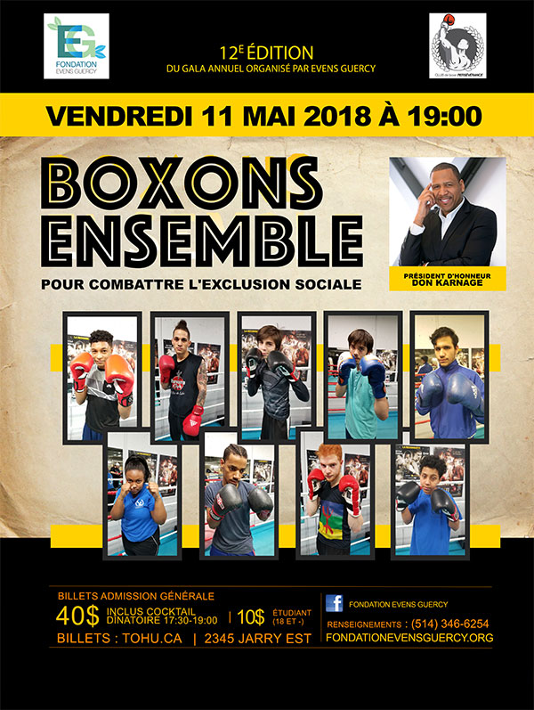C’est avec un immense plaisir que le club de boxe Les Géants de Montréal souhaite vous inviter à son gala annuel, le 11 mai 2018, à 18h00, à la Tohu située au 2345, rue Jarry Est à Montréal. Plus qu’un événement sportif, ce gala est l’accomplissement des efforts soutenus des jeunes de Montréal, à qui nous avons offert une alternative aux pièges de la rue.
